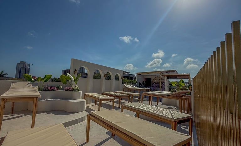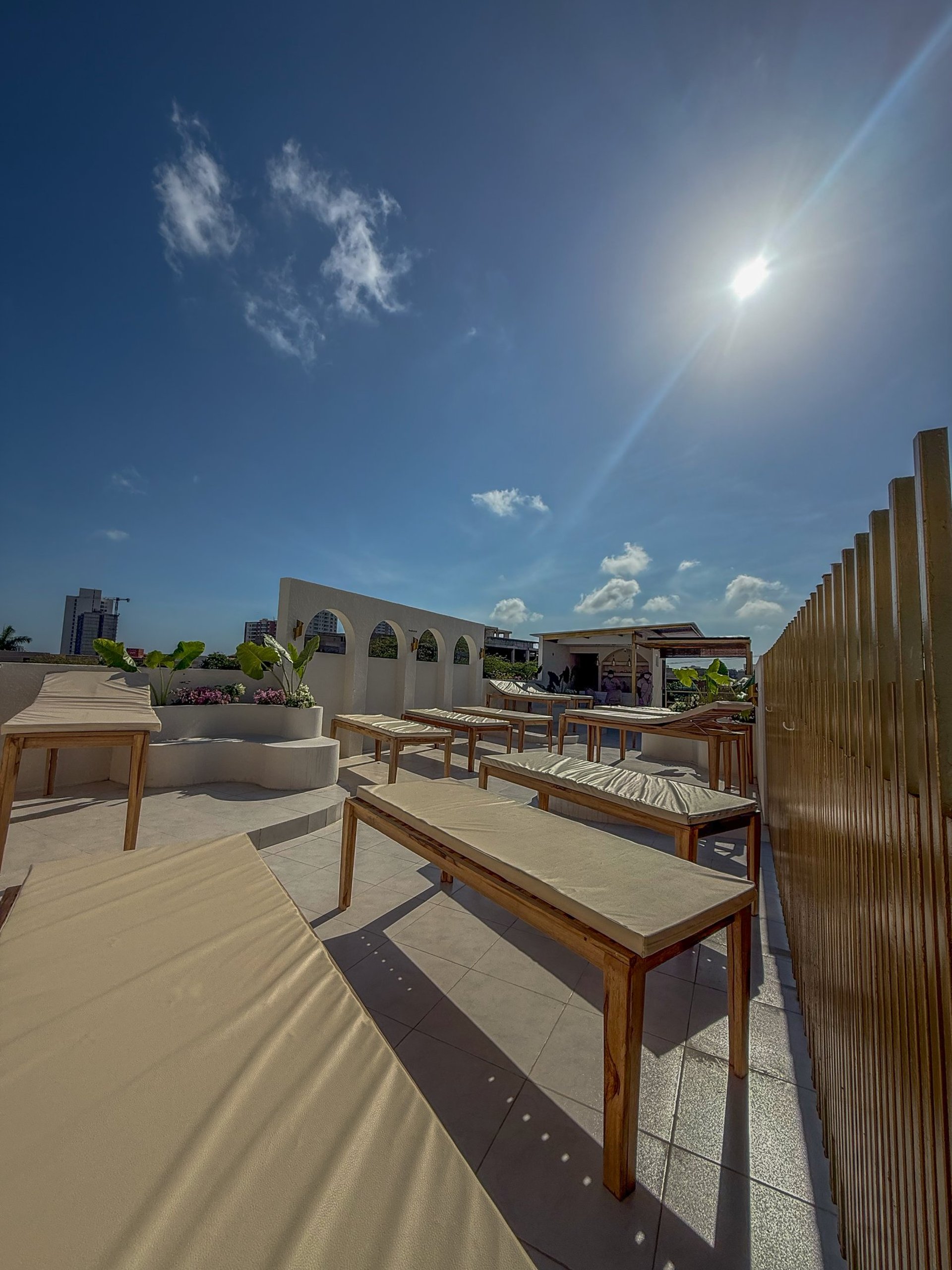 Subes a la terraza, nuestro templo de sol, camilla con sombrilla facial UV